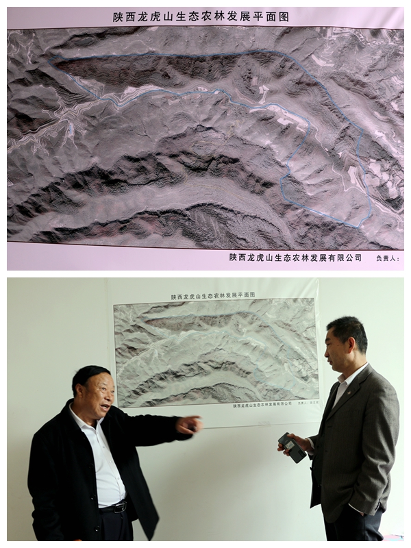 田总在大门口等着我们到来后,进入办公室,参观完后,对着陕西虎龙山生态农林发展平面图对我们说:“仲山距淳化县城西南4公里,为淳化、泾阳两县天然分界,此山峰恋叠翠,幽林穿谷,杂果丰盛,中草药繁多,野生动物可观,怪石嶙峋,异态秀出,原始山林氛围浓郁,为渭北寻幽探奇的天然生态家苑。我们的园地占地100多亩,经济林占地1000亩。基本占据仲山一条山脉。虎龙山频临泾河北岸,仲山山麓,气候宜人,风景优美,山林俊秀,空气清新,是居家,旅游的最佳选地。”