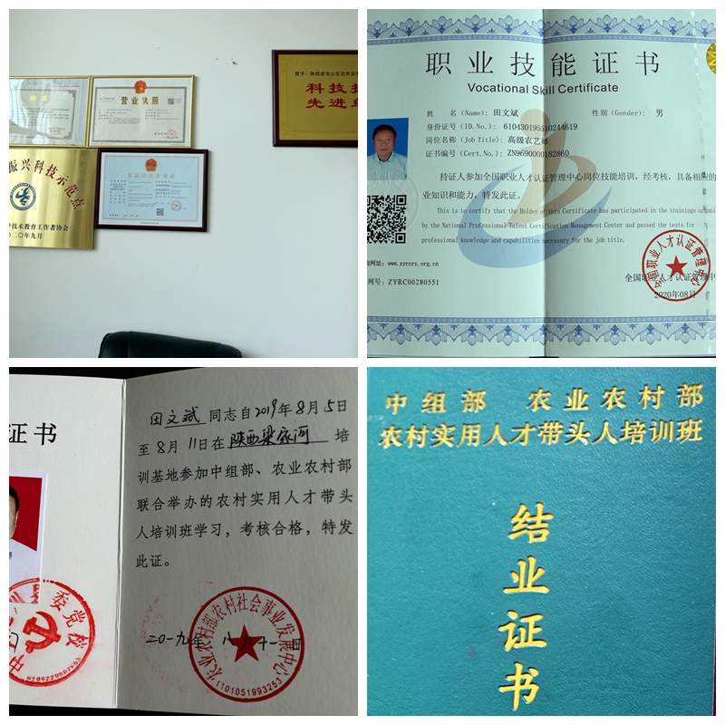陕西虎龙山生态农林发展有限公司2020年被陕西省老科学协会命名为《助力乡村振兴科技示范点》,公司现在拥有120多亩育苗基地,200多亩育种基地,2900多亩地生态山林和一个养殖场。在交谈中,我们看到两本证书,一本是《高级农艺师》的证书,另一本是中组部和农业农村部2019年颁发的《农业实用人才带头人培训班结业证书》。