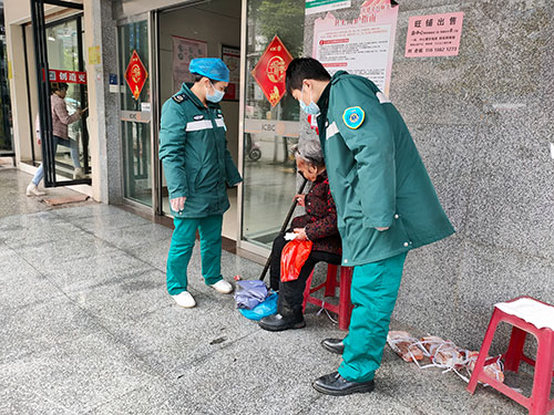 肖玉忠询问老人年纪,老人说自己九十多岁了。肖玉忠问老人,“您怎么摔着了?”老人说:“在家闷得慌,出来遛弯,不想路滑,就摔了。”肖玉忠安慰老人不要着急,救护车马上就来。