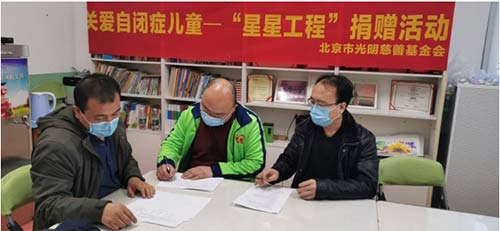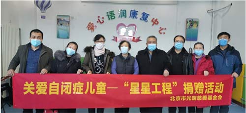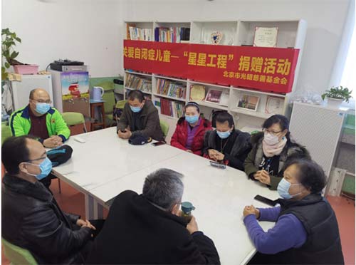 爱心中国网独家报道:2021年1月15日下午,北京市光明慈善基金会团队来到自闭症儿童教育机构:爱心语润学堂,看望在这里学习的自闭症儿童及辛勤耕耘的教职员工,双方交流了自闭症儿童教育现状及新冠病毒疫情下遇到的困难,北京市光明慈善基金会赵大新会长、李林理事长、北京市扶贫济困领域基金会第二联合党委党建专员一行,为孩子们送来了防控疫情隔离消毒液及教学物资等。
