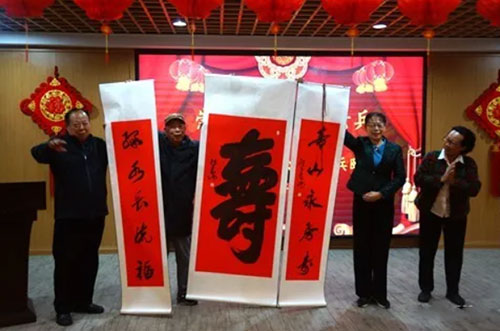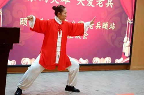 会上特邀爱心书画家也是退伍军人的张万功为公寓赠送了书法作品,为雷锋守墓站岗的老兵作家吴宪领把自己写的书赠送老年公寓,万人太极倡导者、陈氏太极拳第十二代传人曹沁红为与会者表演养生太极八式并现场示教,坚持三十年照顾烈士父母的越战老兵、东方红艺术团团长段建新为大家送上经典军绿歌曲,让老兵们感觉犹如在回军营,弹起那一把心爱的土琵琶。