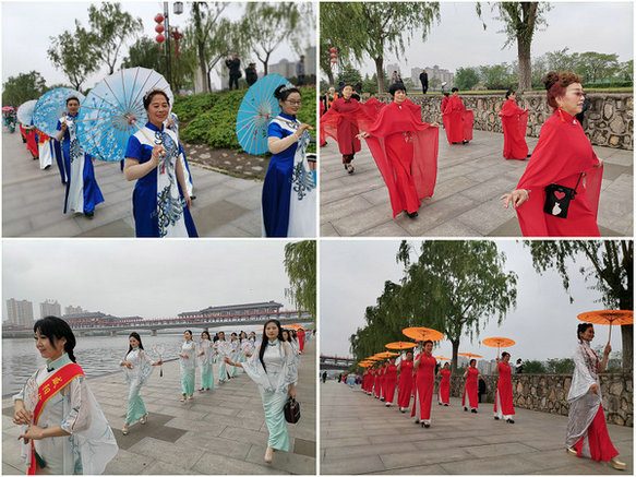 接着,咸阳湖畔,渭水河边,在悦耳的音乐中,模特们或撑开油纸伞、或手握桃花扇,身着不同款式、不同花色的旗袍迈着优雅地步伐缓缓走过。旗袍独具的东方古典美,不仅将东方女人的玲珑身段完美展现,更彰显出优雅与温婉的气质,静静地向世人展示着独具一格的魅力。