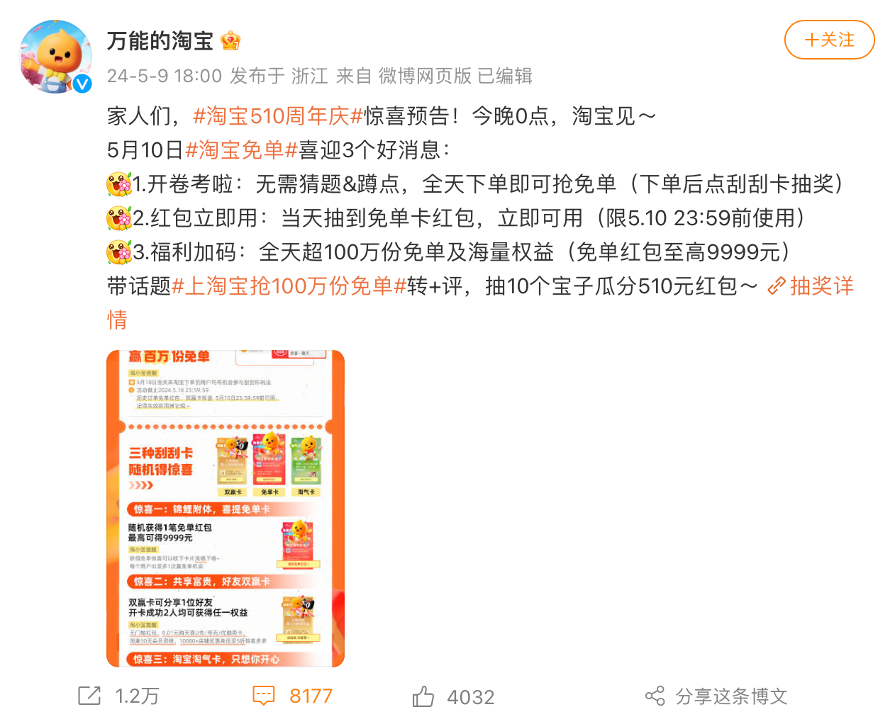 海量商家联动发布生日主题海报,阵势浩浩汤汤,还给广大用户送上实打实的福利,一则由商家“赞助”、为淘宝庆生的锦鲤福利,更是引发网友转发热潮。