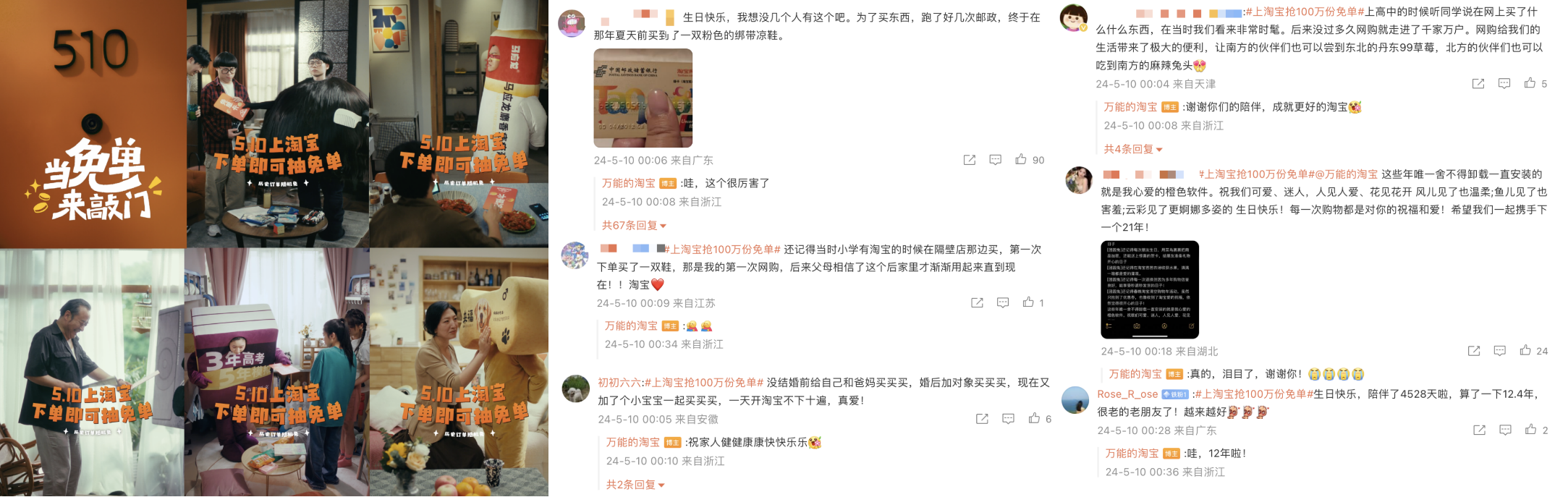 关于如何免单,哪些商品能被免单等问题,淘宝通过一则趣味短片给予引导,化身“真人版”的历史订单商品,敲响用户的家门送上免单卡,用诙谐又直观的方式告诉大家,5月10日来淘宝下单就有机会免去历史订单。看完片子后用户也相继晒出自己和淘宝的故事,和那些被免单商品背后的故事。这样的互动,加强了品牌与用户之间的双向联结,也侧面体现了淘宝走过21年来和用户之间建立的情感纽带之深。