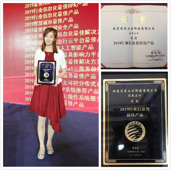 经过7月17日至23日为期一周的网上公示,在评审组多方综合考量下,在本次峰会上,主办方设置颁奖典礼,正式发布评选的人物类、企业类、服务类、技术类、产品类、应用类等六大类别评选结果,在产品类奖项评选中,司库立方获评“2019行业信息化最佳产品奖”,司库立方创始人兼CEO李静女士出席颁奖典礼并上台领奖。