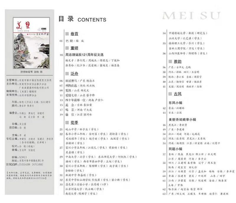 《美塑》总编吴立国,湖南永州人,岭南师范学院南方诗歌研究中心客座研究员,广东省青工作家协会会员,广东省诗歌散文协会会员,东莞市作协会员,东莞市小小说学会名誉副会长。作品散见《中华诗词》《散文选刊》《诗选刊》《文学报》《作品》《黄金时代》《天津诗人》《湖南诗人》等刊物。2012年获得首届广东省优秀企业杂志最佳作品铜奖,2015年入选中国品牌内刊榜十大时代人物,2015年获得东莞市小小说事业推动奖,2016年获得第二届广东省优秀企业杂志总编奖,2018年获得广东省首届优秀小小说“双年奖”小小说事业推动奖。