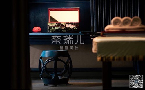 奈瑞儿幽静与浪漫、复古与现代,饶富古韵的陈设摆件,沉潜雅致的自然空间,是对当代东方印象的完美诠释。明式木质家具是这里的一大特色之一,走进奈瑞儿,首先映入眼帘的是表达吉祥如意的红案台,寓意我们每一天都希望带给客人红红火火的吉祥美丽;其后是鲜活明亮的百子柜,模仿东方传统的中药柜,用于收纳护理产品,取五行中木的颜色(绿色)显生机勃勃,表达一种宁静、健康生机之美。招待区会看到一款特别的“沙发”,取名罗汉床,又俗称“罗汉肚皮”,是明清宫廷“宝座”的前身,是东方文化中非常高贵重视的家具,在古代只有皇亲贵族才可以用罗汉床,为待客的最高级别,也是富贵安详的象征。