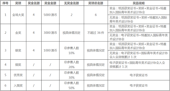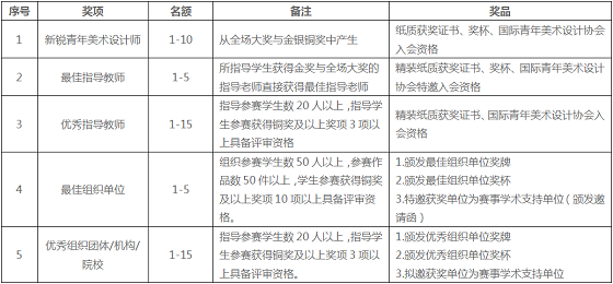 中国大陆赛区获得银奖及以上作品将参与港澳台地区、马来西亚、新加坡、日本等国家及地区一起角逐全场大奖、金奖(奖金)、银奖(奖金)、新锐青年美术设计师等奖项。