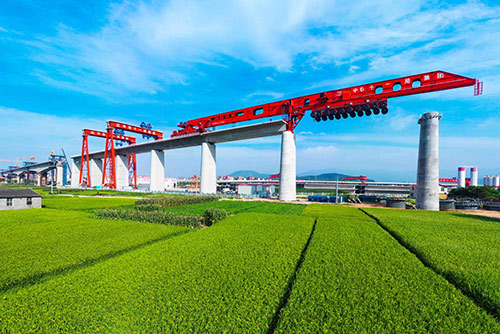 2020年6月22日上午,中铁十一局集团六公司员工运用汉江重工研制的1000吨级运架一体架桥机在福厦高铁湄洲湾大桥工地架设首榀箱梁。