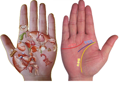 人的双手上有十二条正经脉的86个经穴和224个奇穴,手部集中了与体内所有的器官均有关系的穴位。手掌联结着人体的前部、手背联结着人体的后部各种器官,因此身体内部有无异常的信号更会通过神经、血管和经络反应到指掌的不同部位上来,而指掌的某种部位的形态改变,其中特异性和规律性的改变,就是望诊之掌纹诊病的依据。