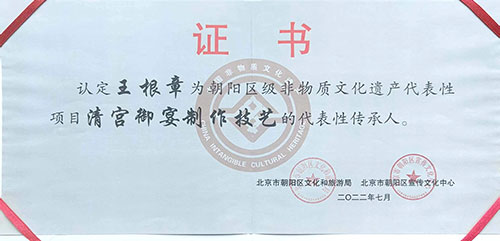 王根章,自幼便对烹饪艺术产生了浓厚的兴趣,他在学习和实践中不断探索,磨练出了一手精湛的厨艺。2022年7月,王根章被北京市朝阳区文化和旅游局、北京市朝阳区宣传文化中心认定为清宫御宴制作技艺的代表性传承人,这一荣誉无疑肯定了他多年来对宫廷御膳的执着追求。