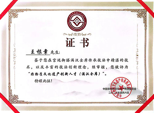2023年4月,王根章的才华再次受到肯定。在中国非物质文化遗产传承委员会的评审中,他凭借在宫廷御膳满汉全席传承技法中的精湛技术和丰富的技法创新理念,被评为“非物质文化遗产创新人才(满汉全席)”。这一荣誉再次证明了他的厨艺和创新能力在宫廷御膳传承中的重要地位。