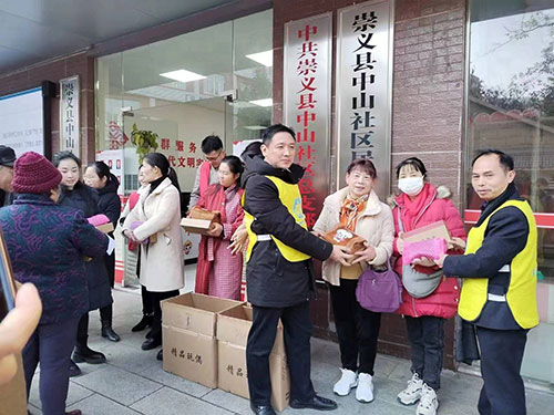 在活动现场,谢文淦团队和崇义益生堂中医(综合)诊所的志愿者为居民发放了暖手袋,让居民在寒冷的冬日感受到了温暖和关爱。