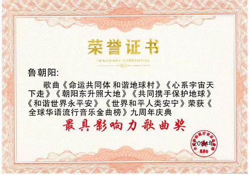 鲁朝阳此次获奖的作品包括《命运共同体 和谐地球村》、《心系宇宙天下走》、《朝阳东升照大地》、《共同携手保护地球》、《和谐世界永平安》以及《世界和平人类安宁》。这些歌曲以宏大的主题和深刻的内涵,传递出对世界的深切关爱与对和平的渴望。