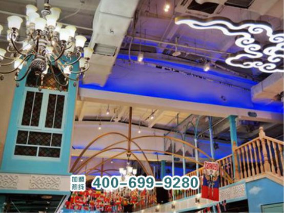 祥云与蓝天呼应,民族特色花纹和镂空设计相互交错,蒂芙尼蓝包围下的浓郁的南疆风情扑面而来。上下两层,中间架空,适合两三人的小聚,适合家庭的大聚,也适合公司团建。一步一景,灯光与阴影互动,仿佛置身与草原之上享受夜景和美食。