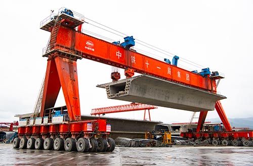 3. 2021年2月10日,中铁十一局集团福厦高铁四标梁场职工在运用汉江重工自行研制的国内首台40米1000吨级搬梁机搬运箱梁。