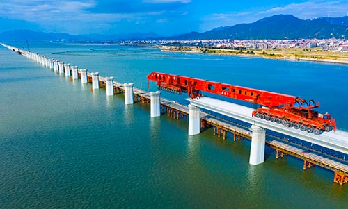 2. 2021年2月9日,中铁十一局集团福厦高铁四标架梁项目部员工运用汉江重工自行研制的国内首台40米1000吨级运架一体机在湄洲湾跨海大桥上架梁作业。
