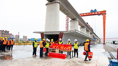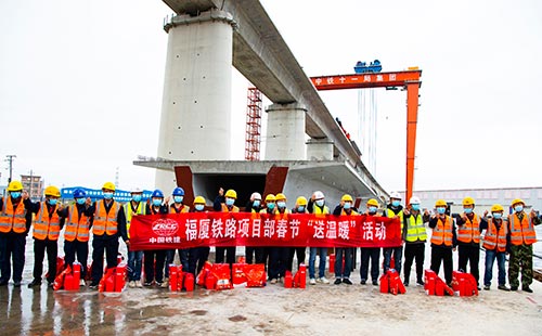 5. 2021年2月10日(腊月29),坚守在施工一线的中铁十一局集团福厦高铁四标架梁项目部施工队员工领到慰问品后欣然在梁场合影的情景。
