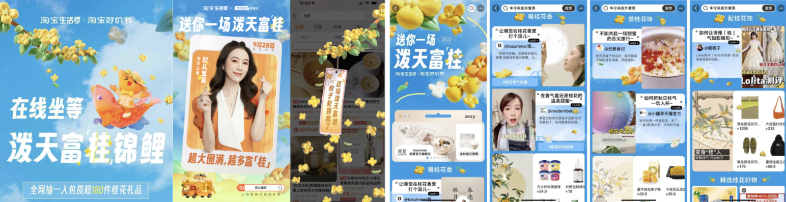 淘宝还第一时间联合了头部主播@烈儿宝贝 打造「超多富桂」主题直播;携手观夏、伊利、满觉陇、南宋胡记等超过 100 家商家全网征集1 位「泼天富桂」锦鲤,把平台势能调动起来:3 年都用不完的桂花香氛、祝你大腹大桂的桂花美食、助你穿桂戴桂的服饰衣品,180 多件的桂花主题礼品,让这个世界上又将诞生一位“桂花主题店店主”。把目光放到站内,还有专属的桂花飘落彩蛋+桂品会场,让每一位用户尽享桂花之美、桂花之味。