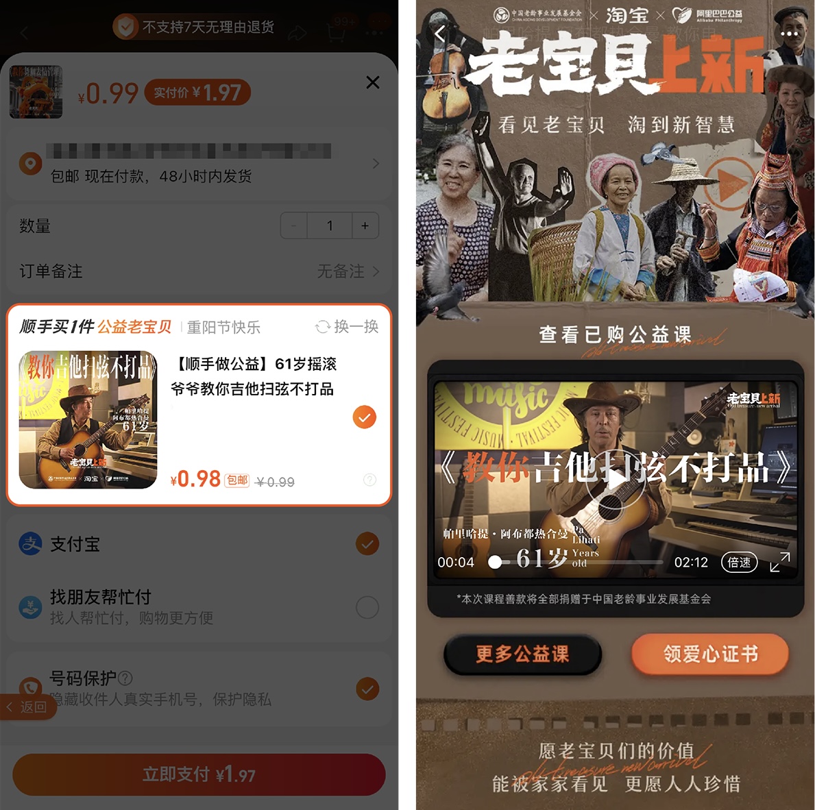 作为电商平台,售卖产品是淘宝的自带属性。而把老年人的价值变身为宝贝展开义卖,让人人参与到助老行动中,是淘宝在孝老敬老公益事业上开辟的新思路。重阳节当日,淘宝在站内开设公益专场,以0.99元/节的价格上线50位老宝贝的技能课程,所得课程收益捐赠给老基会「乐龄陪伴|农村留守老人关爱工程」,用以支持更多需要帮助的老人。