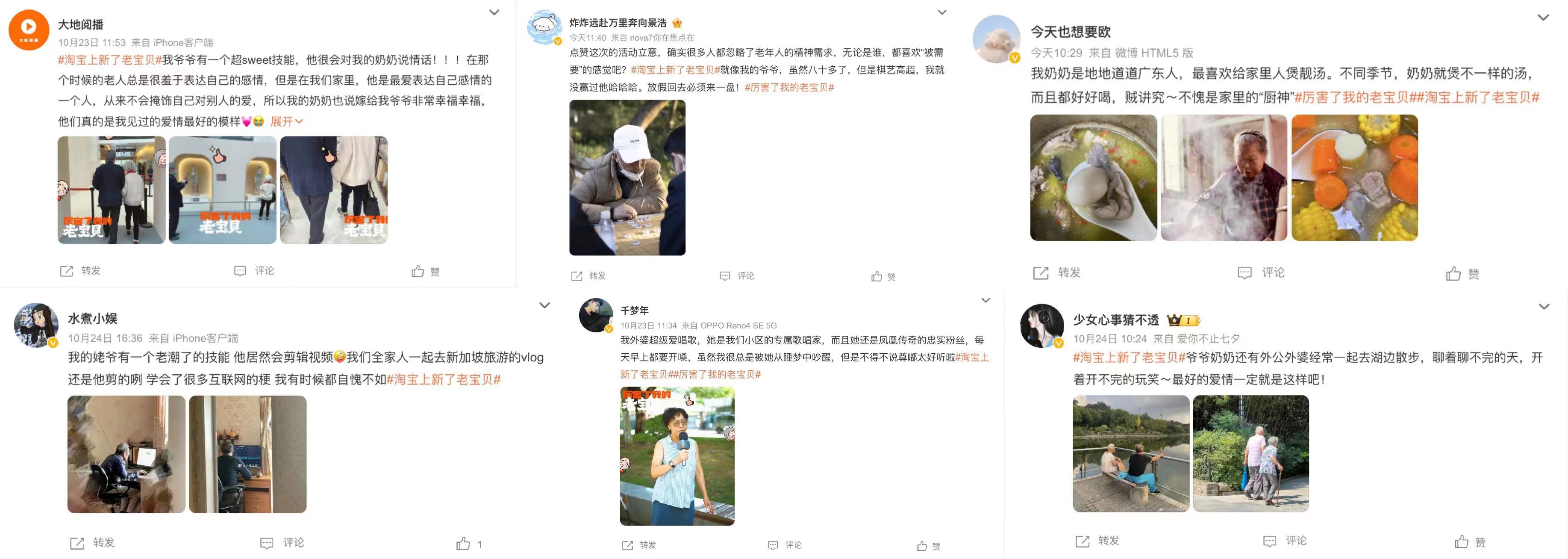 人人参与,才是公益。为此,淘宝联合头部媒体「我要WhatYouNeed」于多社交平台发起#厉害了我的老宝贝#UGC征集,呼吁用户加入自家厉害老宝贝的分享中。截至目前,小红书双话题浏览量破600万,微博双话题互动量超87万。随着活动长尾发酵,越来越多的用户将目光转向身边的老宝贝,实现从线上课程中学习,到挖掘身边老人价值的完美嫁接。用户不仅仅是老人技能课程的“学习者”,更是身边老宝贝价值的“聚光者”、“掘金者”。