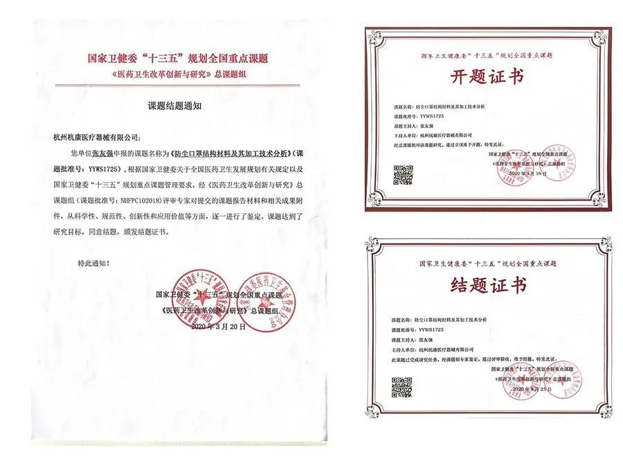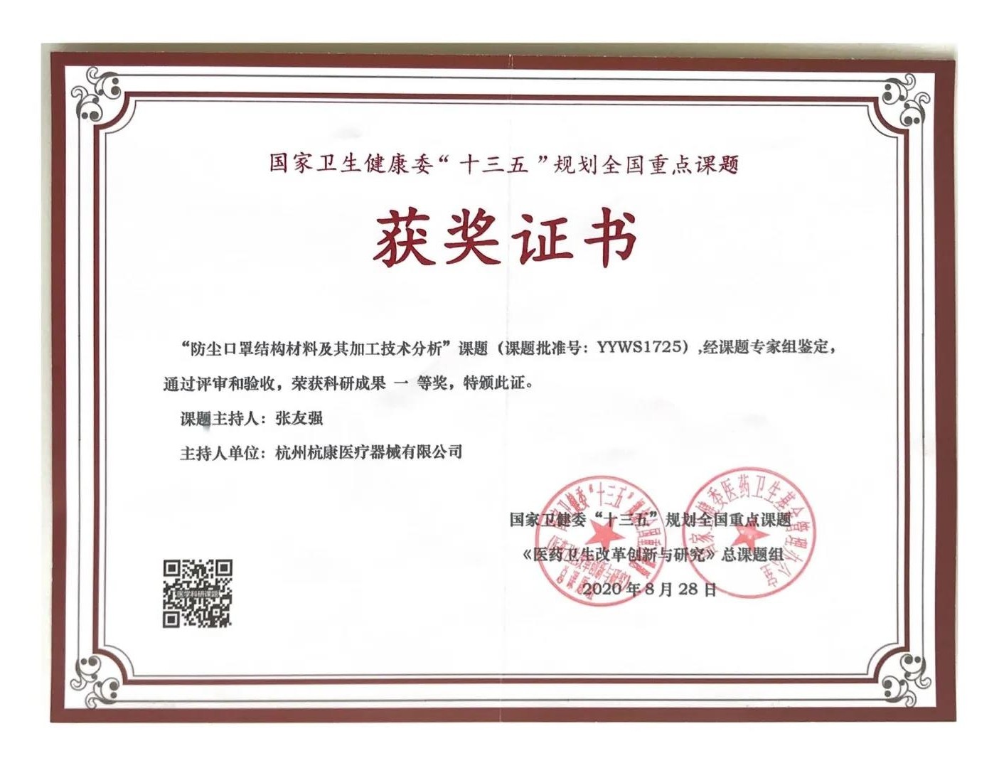 2020年8月28日,杭州杭康医疗器械有限公司总经理张友强先生担任项目负责人的--国家卫生健康委“十三五”规划全国重点课题《防尘口罩结构材料及其加工技术分析》,经专家组鉴定评选,荣获科研成果一等奖。
